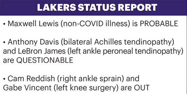 178直播1月27日讯 ,湖人官方公布下一场对阵勇士的伤情报告,刘易斯(非新冠疾病)大概率出战;安东尼-戴维斯(双侧跟腱炎)、詹姆斯(左脚踝腓侧肌腱炎)出战成疑,50%出战可能性;雷迪什(右脚踝扭伤)和文森特(左膝手术)缺席比赛。