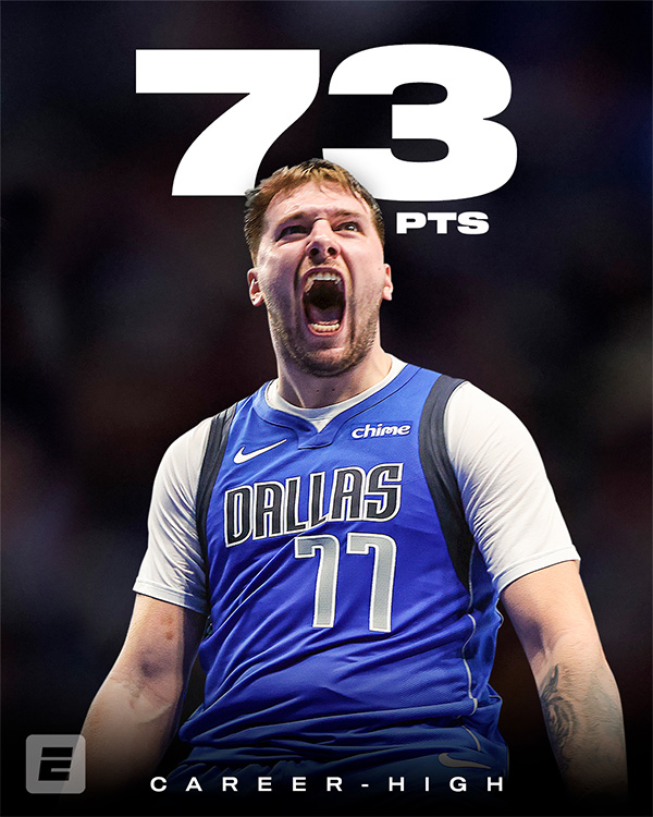 5、东契奇是NBA历史上第一位以超过75%命中率砍下70+的球员。