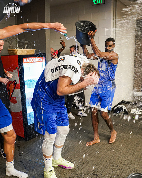 欧文调侃祝贺东契奇,东契奇直言:伙计,我真的太累了;在更衣室中,独行侠众将为东契奇泼水“降温”庆祝,东契奇浑身湿透,之后基德把比赛用球给东契奇,卢卡满脸笑容十分开心。