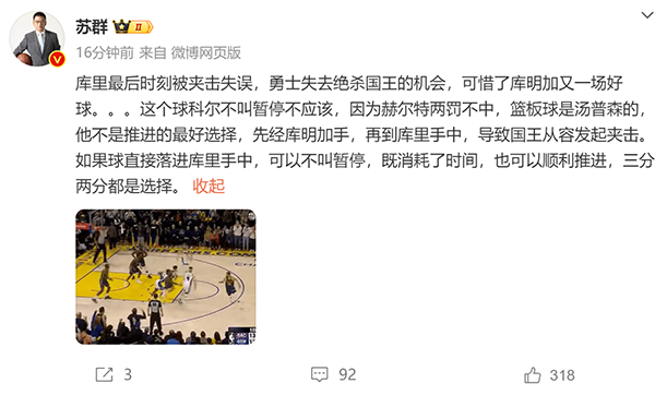 就连名嘴苏群也怒斥科尔,称:库里最后时刻被夹击失误,勇士失去绝杀国王的机会,可惜了库明加又一场好球。。。这个球科尔不叫暂停不应该,因为许尔特两罚不中,篮板球是汤普森的,他不是推进的最好选择,先经库明加手,再到库里手中,导致国王从容发起夹击。如果球直接落进库里手中,可以不叫暂停,既消耗了时间,也可以顺利推进,三分两分都是选择。
