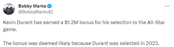 NBA薪资专家Bobby Marks报道,杜兰特因入选全明星而获得120万美元的奖金。