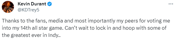 杜兰特生涯第14次入选全明星,发推写道:感谢球迷,媒体,更重要的是我的同行们给我投票,让我第14次入选全明星。我已经迫不及待地想在印第安纳全明星上和有史以来最出色的一些球星一起打球了。