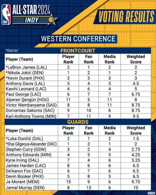 詹姆斯生涯10次票王仍旧位居历史之首;湖人球星浓眉在球迷投票中排名西部前场第4,球员&媒体票排西部前场第5,总排名仅次于詹姆斯、约基奇和杜兰特排名第4,遗憾错失首发。
