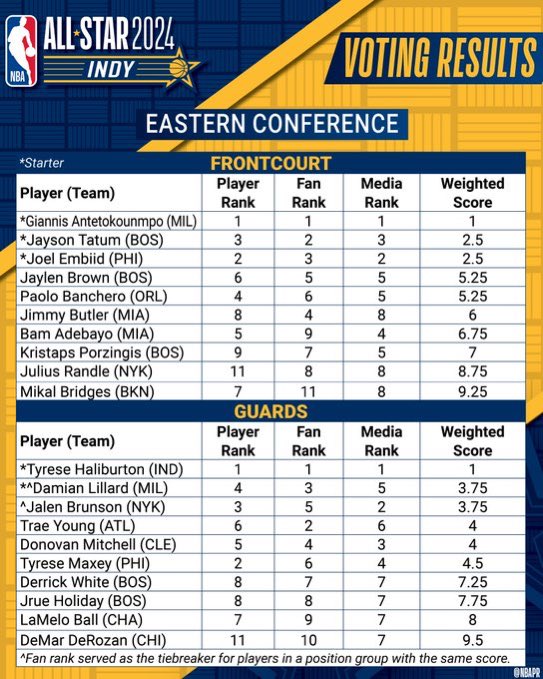 在东部后场首发的竞争中,布伦森媒体票第2,球员票第3,球迷票第5,总分3.75。利拉德媒体票第5,球员票第4,球迷票第3,总分3.75。两人总分打平,但根据规则,球迷票更高的排名更高,布伦森遗憾无缘全明星首发。