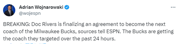 据ESPN名记woj以及shams、Haynes联合报道,道格-里弗斯已经成为雄鹿新一任主教练;双方火速敲定合同,雄鹿总经理说服里弗斯担任球队主帅,率队冲击总冠军。