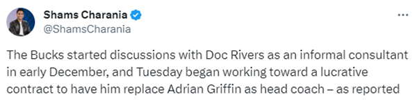 Shams报道称,雄鹿在12月初开始与里弗斯非正式顾问一职进行了讨论,周三与之讨论了一份丰厚的合同让其接替阿德里安-格里芬成为球队新主帅。