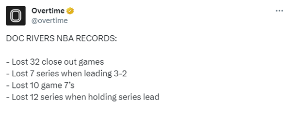 在2007-08赛季,里弗斯率领波士顿凯尔特人队夺得NBA总冠军;2021-22赛季里弗斯荣膺历史15大教练。不过里弗斯也被称为被逆转之王,执教生涯12次领先被逆转,7次遭遇3-1或者3-2领先的情况下被逆转,冲击分区决赛已经遭遇10连败。