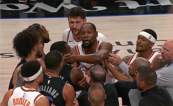 客场大战独行侠,太阳5-13开场落后8分,期间两队爆发冲突——格威推倒杜兰特并上前挑衅,努尔基奇为KD抱不平,直接推飞格威,双方火爆冲突,最终他们三人都吃到技术犯规;杜兰特和布克带队追分,无奈独行侠下起三分雨,首节打完太阳落后9分。