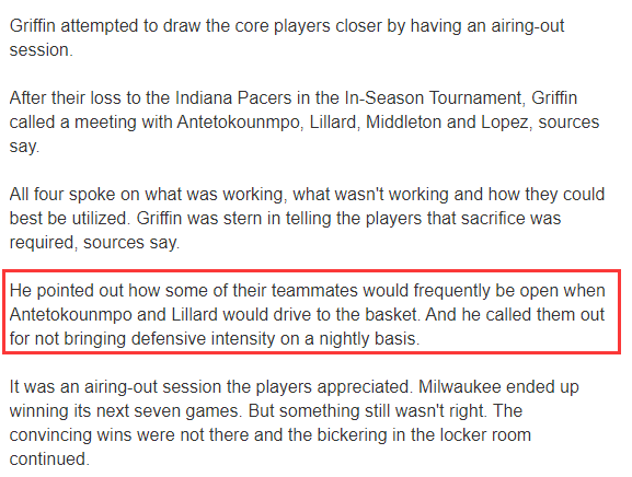 格里芬在会议上指出,当字母哥和利拉德突破到篮下时,没有给处在空位的队友传球,还批评了他们没有每晚都尽力去防守。