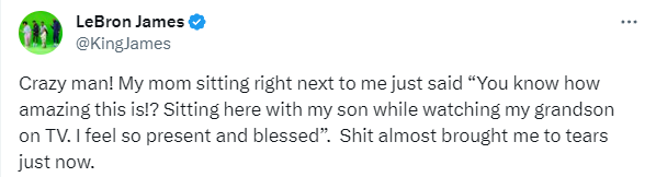不久前,39岁的詹姆斯发推写道:太疯狂了!我妈妈坐在我旁边对我说:‘你知道这有多神奇吗?我和我儿子坐在这里一起看孙子在电视里(打比赛)。我感受到一种很强的存在感和幸福感。’刚才我差点哭了。