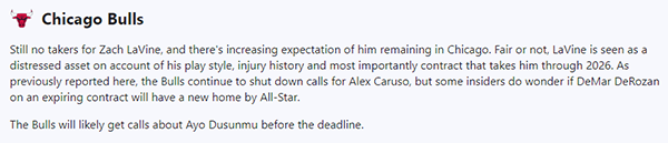 公牛继续将卡鲁索视为非卖品,联盟内部对德罗赞是否会与公牛续约保持关注(本赛季结束后合同到期)。此外,道苏姆也正在受到多支球队的关注,公牛很可能在截止日前接到有关他的报价电话。