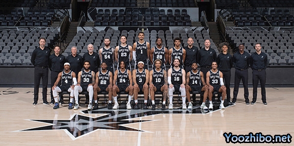 站在第二排的球员分别是马穆凯拉什维利、科林斯、文班亚马、巴锡和巴洛,马刺教练组也都整齐地站在第二排。