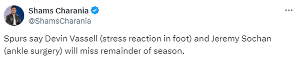 今日马刺官方宣布瓦塞尔和索汉赛季报销——核磁共振显示瓦塞尔的右脚出现“应激反应”,在与专家协商后,索汉确定需要进行左脚踝关节镜手术,他们都因伤缺席本赛季剩余的比赛。