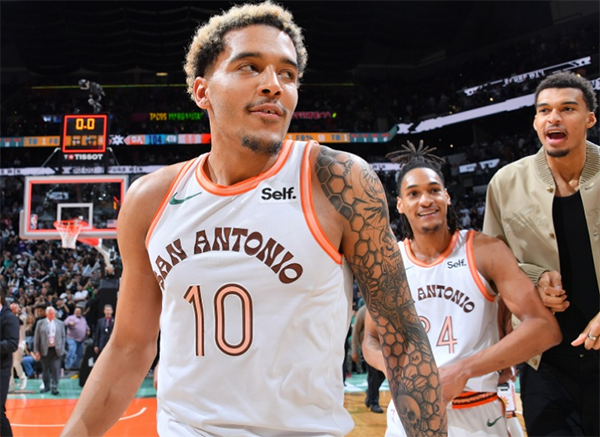 约翰逊面带笑容坐在C位,文班亚马站在第二排十分抢镜;赛季至今,约翰逊场均拿到15.8分5.5篮板2.9助攻;文班亚马则是场均拿到21.2分10.5篮板3.6助攻3.4盖帽和1.3抢断。