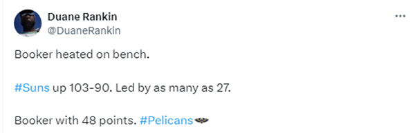 下半场,第三节开场布克命中创生涯新高的第7记三分,之后连投带罚继续得分,并且带队把领先优势扩大到27分,可之后布克突然手感下滑,太阳进攻明显下滑,被鹈鹕一波流迫近比分,这一节布克7中3拿到11分,但三节打完太阳领先还剩13分,据报道,布克在替补席暴怒发脾气。