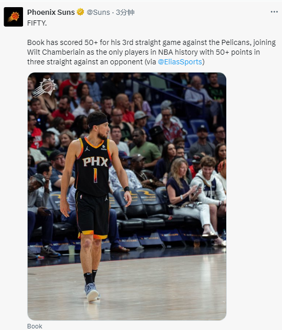 10、布克面对鹈鹕连续三场至少轰下50+,比肩张伯伦成历史第二人
