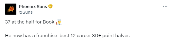 2、布克生涯第12次半场至少30分为太阳队史最多