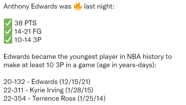 另外,爱德华兹还是史上单场命中10记三分最年轻的球员,他完成这一神迹的时候是20岁132天,而此前的纪录保持者是欧文,他在2015年1月达成,当时他是22岁311天。生涯前100场比赛命中比爱德华兹(258个)更多三分的球员只有热火的邓肯-罗宾逊(326个)。