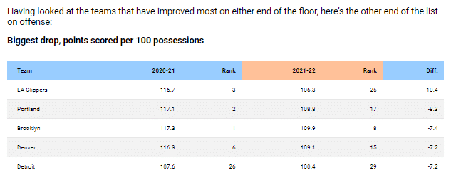进攻退步最大的球队是快船,上赛季的进攻效率116.7(百回合得分),位列联盟第3,本赛季只有106.3,排名联盟第25,相比之下下降了10.4.