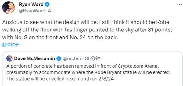 科比雕像该是什么造型呢?湖人记者Ryan Ward表示:迫不及待地想看看设计是什么样子的。我仍然认为应该是科比狂砍81分后单手指天的动作,前面是8号,后面是24号。