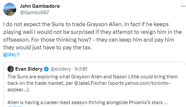 对于太阳兜售格雷森-阿伦的消息,太阳资深媒体人John Gambadoro发推表示:我认为太阳不会交易格雷森-阿伦。事实上,如果他继续发挥出色,太阳在今年夏天尝试与他续约也不会让我意外。对于那些问我要怎么做才能让阿伦留下的人。我的答案是,付他钱就行,交奢侈税就完事了。