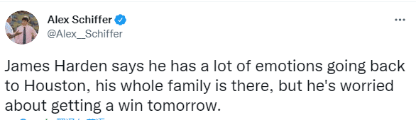 赛后,哈登谈到下一场对阵旧主火箭,登哥表示重返休斯顿,他会有很多的情绪,他的家人都在那里;不过他更在乎的是赢球。
