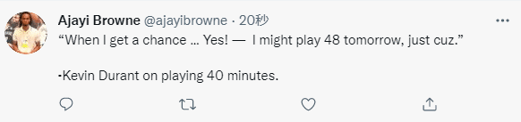 赛后,杜兰特谈到本场比赛出战40分钟,KD表示他喜欢打篮球,他会处理好负荷管理,直言:当我有机会,我就会上场,明天(对阵火箭)我可能打满48分钟,只是因为给你们大家一些谈论的话题。