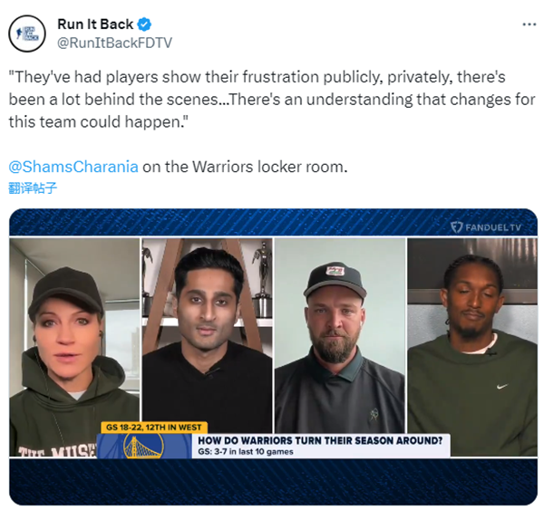 名记shams在节目中谈到了勇士队的现状,他表示:球员们公开或私下表达了他们的不满情绪。幕后也有很多,大家都明白,这支球队可能会发生变化。不满和沮丧最好保留在内部。但是这支球队一直在不停地输,所以大家对于球队状态不佳、季中锦标赛被淘汰、胜率不到50%等等糟糕现状肯定有这样那样的不满。现在除了库里的每一个人都被摆上了货架,这会加剧不满。