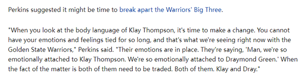 勇士内忧外患,名嘴帕金斯建议勇士交易追梦和克莱,帕金斯在节目中说:当你看到克莱-汤普森的肢体语言时,你会发现是时候做出改变了。你不能把自己的情绪和感受束缚太久,这就是我们现在看到的勇士队。“他们的情绪很到位。他们说,‘伙计,我们对克莱-汤普森的感情太深了。我们对德拉蒙德-格林的感情如此深厚’;但事实是他们两个都需要交易。他们两个。克莱-汤普森和德拉蒙德-格林。