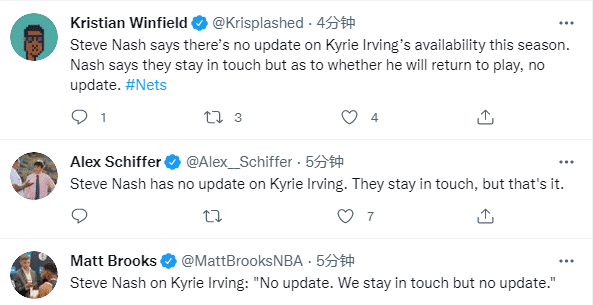 对于欧文的情况,纳什表示他一直和欧文保持联系,但没有任何更新,仅此而已。