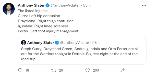 178直播11月20日讯 ,据勇士记者Anthony Slater报道,今日对活塞一战,勇士的库里、格林、伊戈达拉和奥托-波特四人都将缺阵。这是勇士四连客的最后一场比赛,他们迎来了一个大轮休日。伤病名单上,库里是左臀挫伤,格林是右大腿挫伤,伊戈达拉是右膝酸痛,波特则是左脚伤病管理。