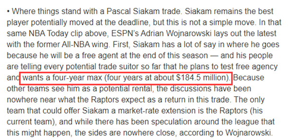 Kurt Helin报道,西亚卡姆仍是交易截止日前可能被交易的最好的球员之一,西卡对自己的下家有很大的发言权,因为他将在本赛季结束后成为自由球员,到目前为止,他计划在夏天进入自由市场,并想要一份四年约1.845亿美元的顶薪。