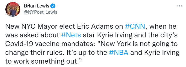 178直播11月06日讯 此前曾有美媒报道纽约有可能改变防疫规定,欧文有可能不用接种疫苗就能重返赛场;可如今纽约新市长埃里克-亚当斯再次谈到关于欧文的话题,他公开表态:纽约不会改变他们的防疫规定,这取决于NBA和凯里-欧文双方来解决问题。