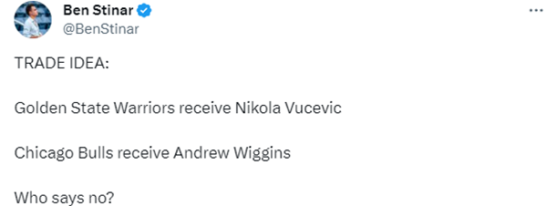 勇士队记认为维金斯将被交易离队,NBA记者Ben Stinar建议勇士把维金斯交易到公牛,换来武切维奇从而补强内线;另外据此前报道,勇士全队除了库里之外的所有人都可以被交易,西亚卡姆是勇士引援目标之一,目前猛龙正在积极兜售西卡。
