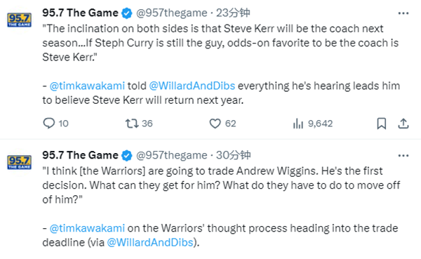 勇士记者Tim Kawakami在节目中谈到了与勇士相关的交易传言,他表示:我认为勇士将交易走安德鲁-维金斯,他将是勇士队第一个被交易的,他们能用他换来什么?他们要怎么做才能摆脱他?