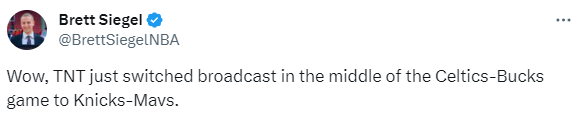 三节打完雄鹿111-70已经领先41分,据NBA记者Brett Siegel报道,TNT临时换台,把雄鹿和绿军的全美直播换成了独行侠和尼克斯的比赛。之后雄鹿官方发推质问TNT为什么把全美直播撤销了。