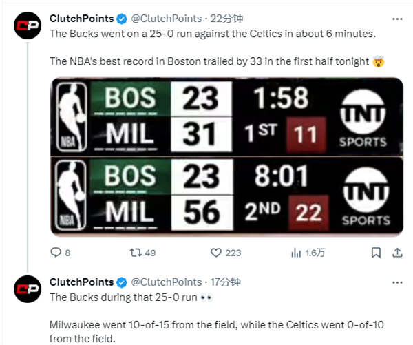 雄鹿创纪录——上半场赢37分创队史第四大半场赢分纪录