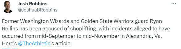 178直播01月12日讯 ,据美媒The Athletic记者Josh Robbins报道,前勇士和奇才球员罗林斯摊上事了,因多次偷东西被指控偷窃罪;据悉,21岁的罗林斯7次偷窃蜡烛、沐浴露等物品,每次金额都不超过1000美元。