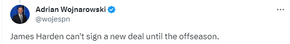 小卡已经续约,乔治的新合同正在谈,哈登何时才能续约?名记woj报道,哈登要到休赛期才能签下新合同。