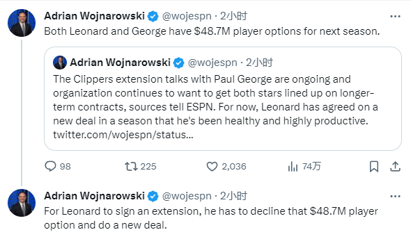 小卡正式续约后,名记woj报道,快船和乔治的续约谈判也正在进行中,球队仍希望与小卡和乔治两位球星签订长期合同。快船很可能已经为乔治的续约设定了最低薪水,乔治也必须拒绝4870万美元的球员选项才能与快船打成新合同。