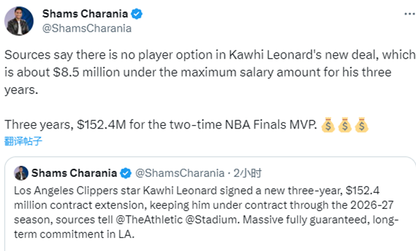 名记woj进一步报道,小卡续签前拒绝了下赛季4870万美元的球员选项,这份新合同第一年薪资为5200万美元,这取代了小卡上一份合同的球员选项,后两年的年薪都是5000万美元。
