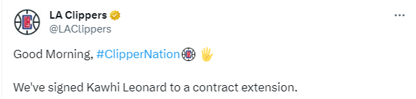 快船官方已经宣布与小卡提前续约,据报道,他们双方续签3年1.524亿美元的新合同;快船总裁劳伦斯-弗兰克发布声明,表示:我们很高兴能继续和莱昂纳德合作,他是一名精英球员,一个出色的搭档,一个知道如何获胜并将其作为第一要务的伟大球员,从他到来的那一刻起,他就提升了我们的球队,我们很幸运他在5年前选择加盟快船,我们也很高兴能和他一起继续建设球队。