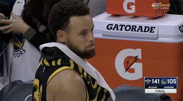 主场对阵鹈鹕,勇士第一节27-46落后19分,虽然第二节追回6分,但第三节又被打爆了,比赛早早沦为垃圾时间,末节最多落后到41分,最终105-141惨败36分;库里坐在替补席十分沮丧和无奈,再次亲眼看着球队遭遇一场惨败。