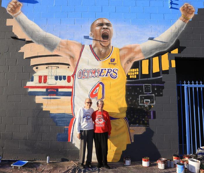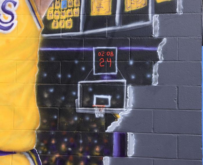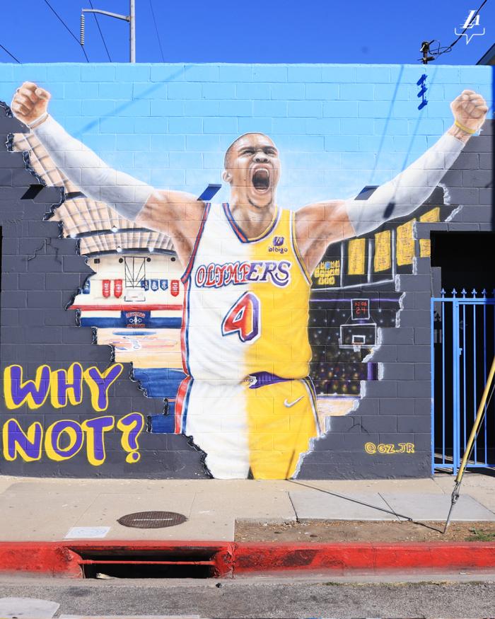 威少的该处巨幅壁画是他身穿高中4号球衣和身穿湖人0号球衣的结合体,一边写着威少的口号“为什么不呢(WHY NOT?)”另一边则是画着湖人队史已退役的球衣号码以及多面总冠军旗帜,科比的8号和24号十分醒目,还有魔术师、张伯伦、埃尔金-贝勒、奥尼尔、贾巴尔、韦斯特等传奇人物的球衣号码。