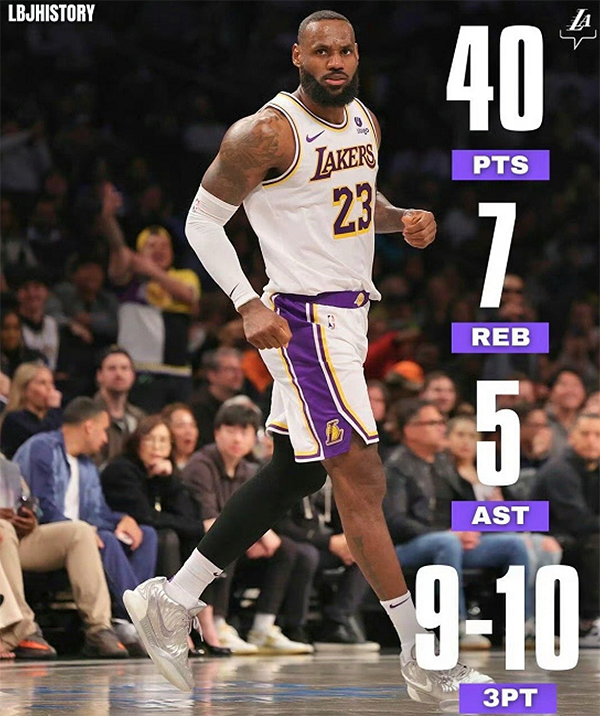 178直播讯 北京时间4月1日,NBA常规赛结束一场焦点战,湖人客场116-104击败篮网,这场比赛紫金军团赢球的第一功臣毫无疑问是詹姆斯,他全场轰下40分7篮板5助攻,同时他全场比赛的三分球10次出手,命中9球,表现极其出色,单场比赛9个三分球,詹姆斯追平生涯纪录。八村垒20分10板4助、浓眉24分14板3帽,拉塞尔拿下18分。