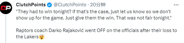 赛后谈到猛龙和湖人末节罚球2-23,猛龙主帅拉贾科维奇怒目圆睁十分生气,趴着桌子怒斥联盟,表示:“简直就是耻辱!裁判可耻,让这个事情发生的联盟也是可耻的。第四节罚球对比23-2,你告诉我,第四节我只有2个罚球我怎么打。