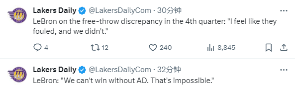 浓眉末节5投4中、罚球11中11独砍20分,最后33秒连续8罚全中;浓眉全场17投13中、三分2中2、罚球14中13狂砍41分11篮板6助攻成为湖人赢球的最大功臣。