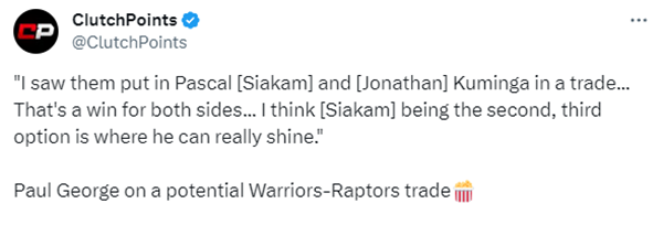 快船球星乔治在节目中谈到了勇士与猛龙的潜在交易, 他表示:我认为让西亚卡姆与库明加互换东家,这会是双赢。勇士方面,西亚卡姆具备成为当家球星的能力,但他更适合去当个球队2、3当家,他是那种什么都会一些的球员,2、3当家才是他真正能发光的定位。我认为西卡与库里、克莱很适配,他们三个可以拉出很棒的球场空间。西卡还能护板和组织。