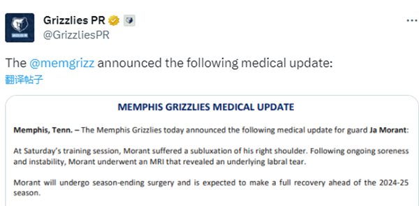 据灰熊官方报道,莫兰特在当地时间周六的训练中遭遇右肩脱臼,MRI检查后发现存在盂唇撕裂,他将接受手术治疗,因伤赛季报销,预计将在24-25赛季开始前完全康复。