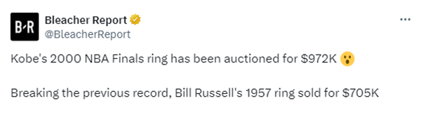 这枚总冠军戒指是科比在2000年送给他的父亲乔-布莱恩特的,在拍卖会上以97.2万美元的价格售出,打破了NBA总冠军戒指的拍卖纪录;此前纪录是比尔-拉塞尔1957年的第一枚冠军戒指,于2021年以70.5万美元的价格被拍卖。